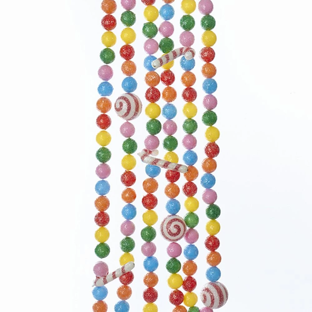 This 6-foot candy cane garland is a fun and festive addition to any holiday decor. This garland has small multi-colored gum drop-like beads, with larger red and white peppermint and candy cane pieces arranged throughout.