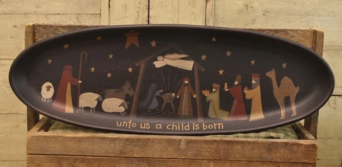 Decorative Nativity Tray, reads unto us a child is born.