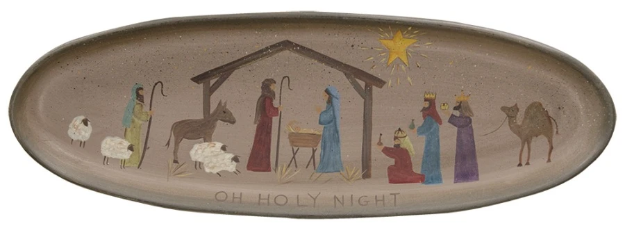 The Oh Holy Night Tray is in a classic hand painted nativity tray. This tray has a tan background with slight speckling and the words “Oh Holy Night.”
