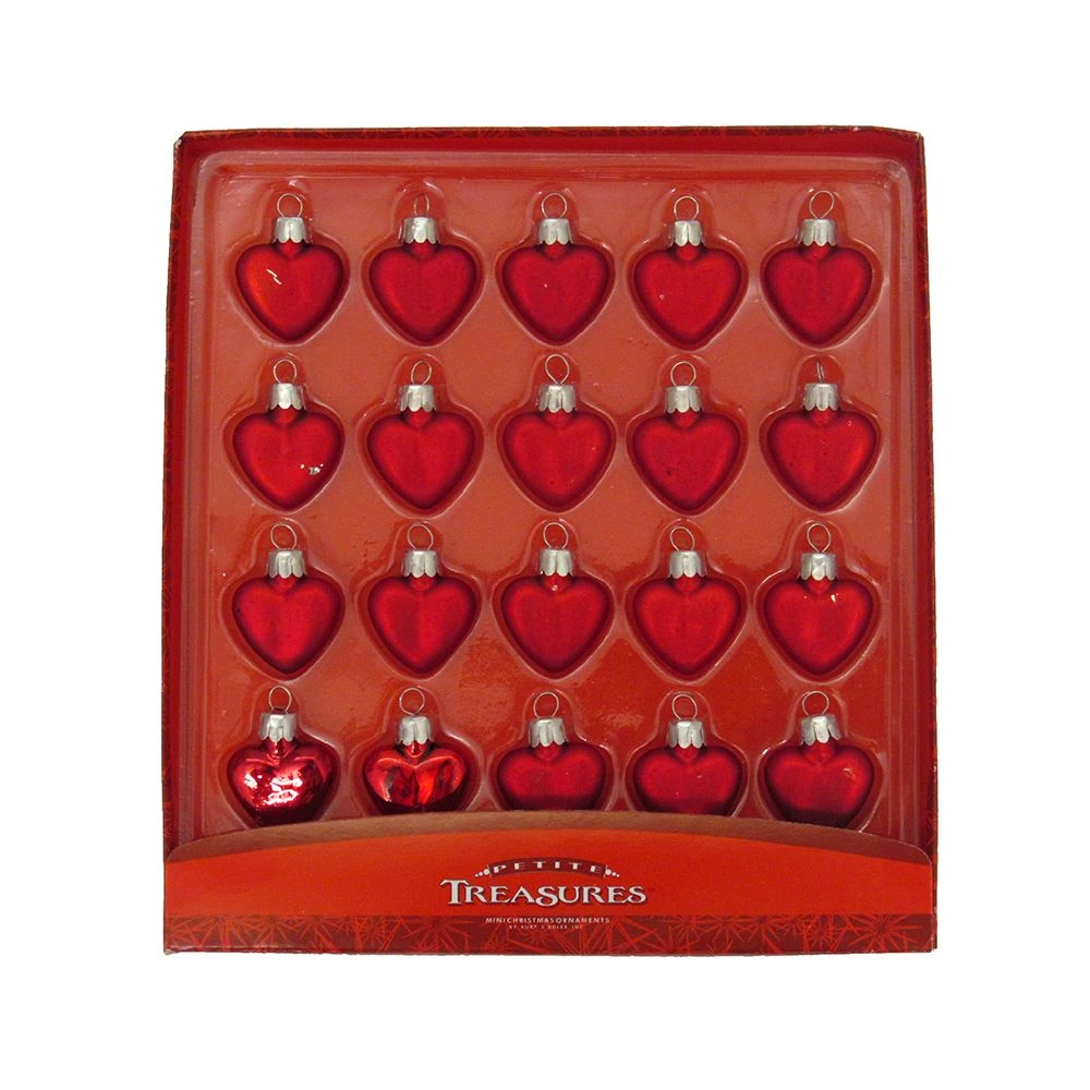 Add a vintage touch to your holiday decor with this Petite Treasures miniature red heart ornament set. These miniature ornaments are sure to add a classically festive touch to your holiday decor. Each of the 20 ornaments is made of glass and has a simple red heart design.